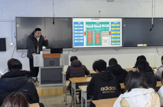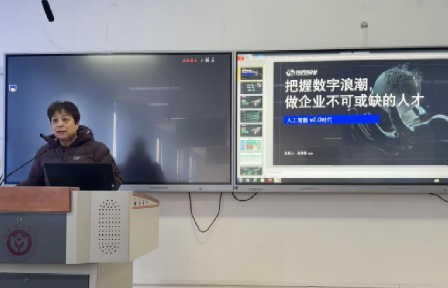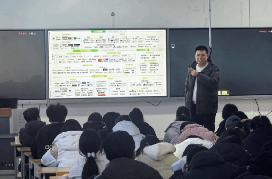 其次,在行业发展解读环节,他借助可视化资料,对人工智能的发展历程进行了梳理,并剖析了当前大模型工业化、具身智能、AI民主化的三大技术趋势。同时,他结合国家政策背景与地方规划,剖析了人工智能在企业智能化、垂直领域爆发、人机协作重构等方面的行业应用,让学生对行业前沿动态与政策导向有了全面认知。此外,他还通过智能家庭服务、智慧仓储物流、无人化商业、高危环境电力巡检等场景案例,展示了具身智能机器人的实际应用,生动诠释了技术与实体经济的融合路径。